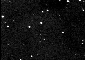 The asteroid is currently faint, at magnitude 20.2 in the constellation Cetus. John provided us an image from the time of discovery (the asteroid is in the crosshairs in the middle in the image to the left). This is a 4-minute exposure taken through a 10" Schmidt-Cassegrain telescope on August 15, 2002 taken on the day he reported the object to the MPC.