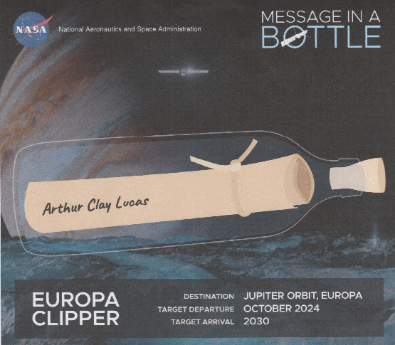 Dad's name is also on its way to Europa, one of the moons of Jupiter, on the Europa Clipper! The Clipper was launched October 14, 2024 and is set to reach Jupiter in April 2030. Read more about the "Message in a Bottle" program here.